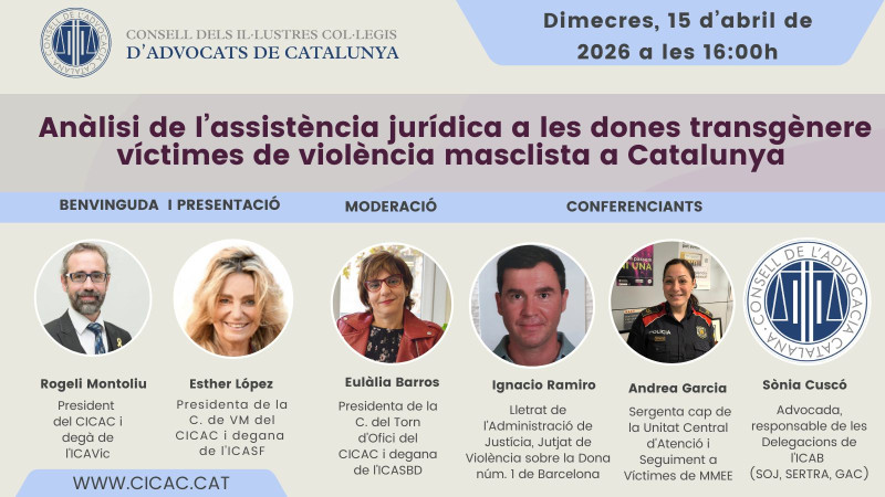 El Consell de l’Advocacia Catalana organitza un webinar amb el títol 'Assistència jurídica a les dones transgènere víctimes de violència masclista'. En ell, s'hi analitzarà l’aplicació pràctica de la Llei 4/2023, de 28 de febrer, per a la igualtat real i efectiva de les persones trans i per a la garantia dels drets de les persones LGTBI en l’àmbit de l’assistència jurídica a les dones transgènere víctimes de violència masclista. Es vol abordar el procediment registral, mesures administratives, protocols policials i la protecció centrada a l’àmbit de la justícia i concretament en l’àmbit de l’assistència jurídica gratuïta i la seva aplicació a Catalunya a la llum de la Llei 17/2020, del 22 de desembre, de modificació de la Llei 5/2008, del dret de les dones a erradicar la violència masclista.